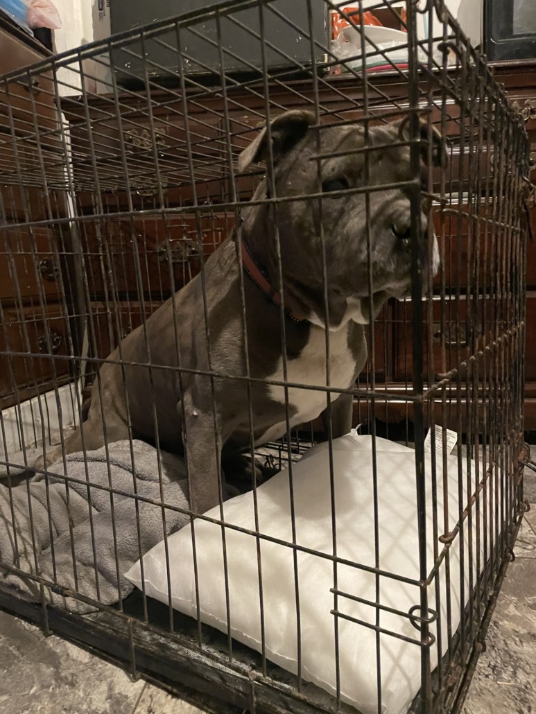 Grey pit mix with white on chest very well mannered well trimmed nails rabies tag on collar proof of ownership please