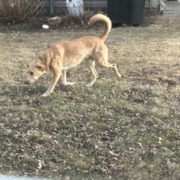 Was traveling with another dog that was smaller and darker. The smaller dog appeared to be black and brown, but might have had some white.