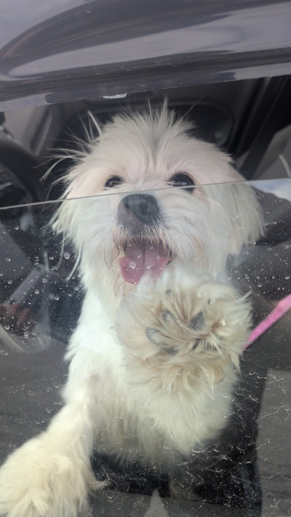 ‘I WAS IN MY CAR AND THE DOG RAN OUT TO ME AS IF SHE WAS SCARED. I WENT OUT TO CATCH HER AND ASKED AROUND THE AREA IF IT WAS ANYONES. NO ONE CLAIMED THEM.’
