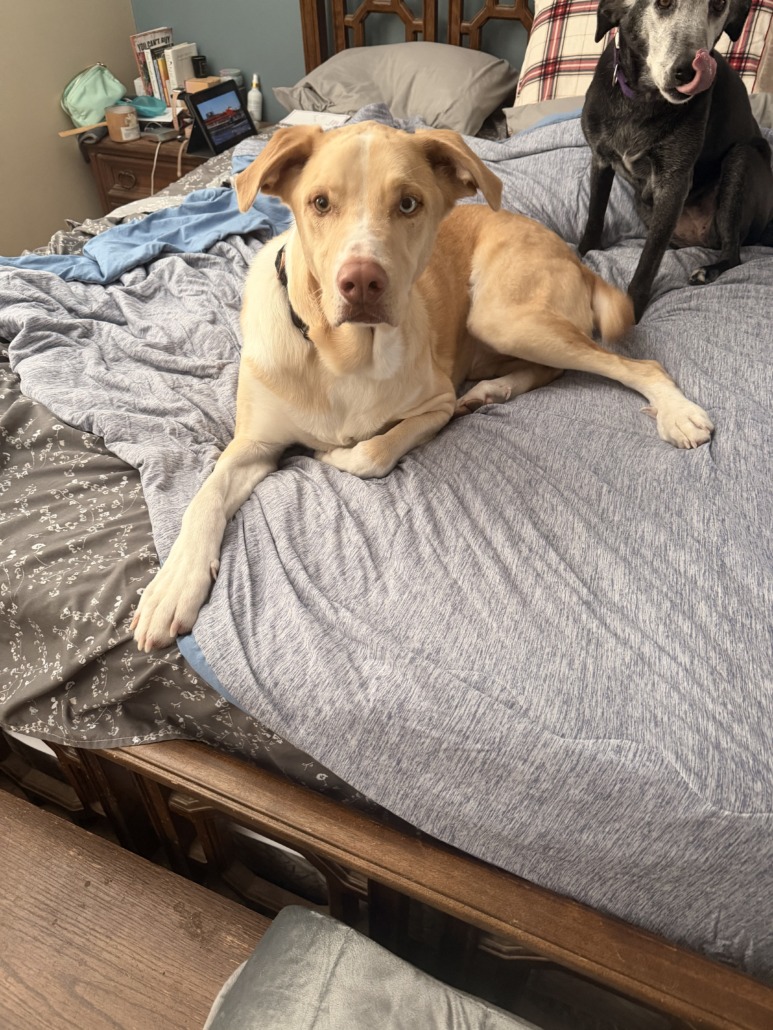 Tall, skinny long haired mixed breed. He has 2 different colored eyes. Very sweet and gentle. He isn’t skiddish, but may run if you chase him(mainly thinks you’re playing