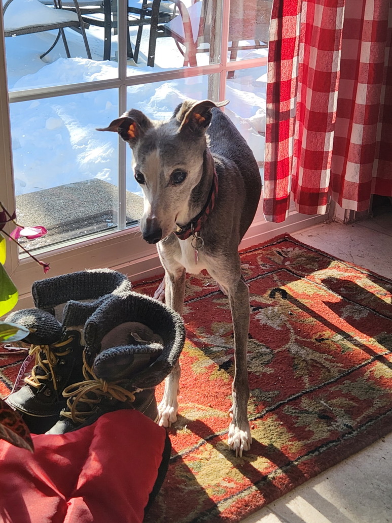 Italian Greyhound, deaf, blind, very old and frail. Blue and white