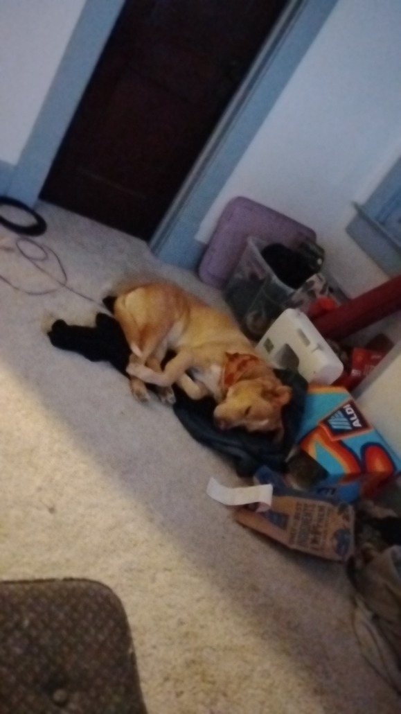 Golden Pitt Mutt, she craves attention and food more than anything. Trash goblin who jumped the fence this afternoon. Her stomach was upset earlier this morning from unknown cause (probably eating smth in the bushes she shouldn’t have on a walk). Jumped the fence to chase an alley cat and lost sight of her in a neighbors yard. Please contact if spotted or found. She is collared, tagged, and wearing a bandana. Very well loved.