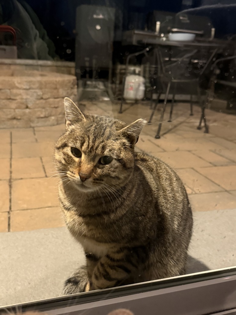 It seems friendly but wouldn’t come close to me. Gave some food and water. Cat hung around on the porch and then left.