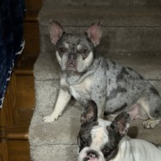 Gray/Merle French bulldog. No collar or microchip. Will respond to Laniey, Laniey Bug, or Bug/Buggy. She is friendly.