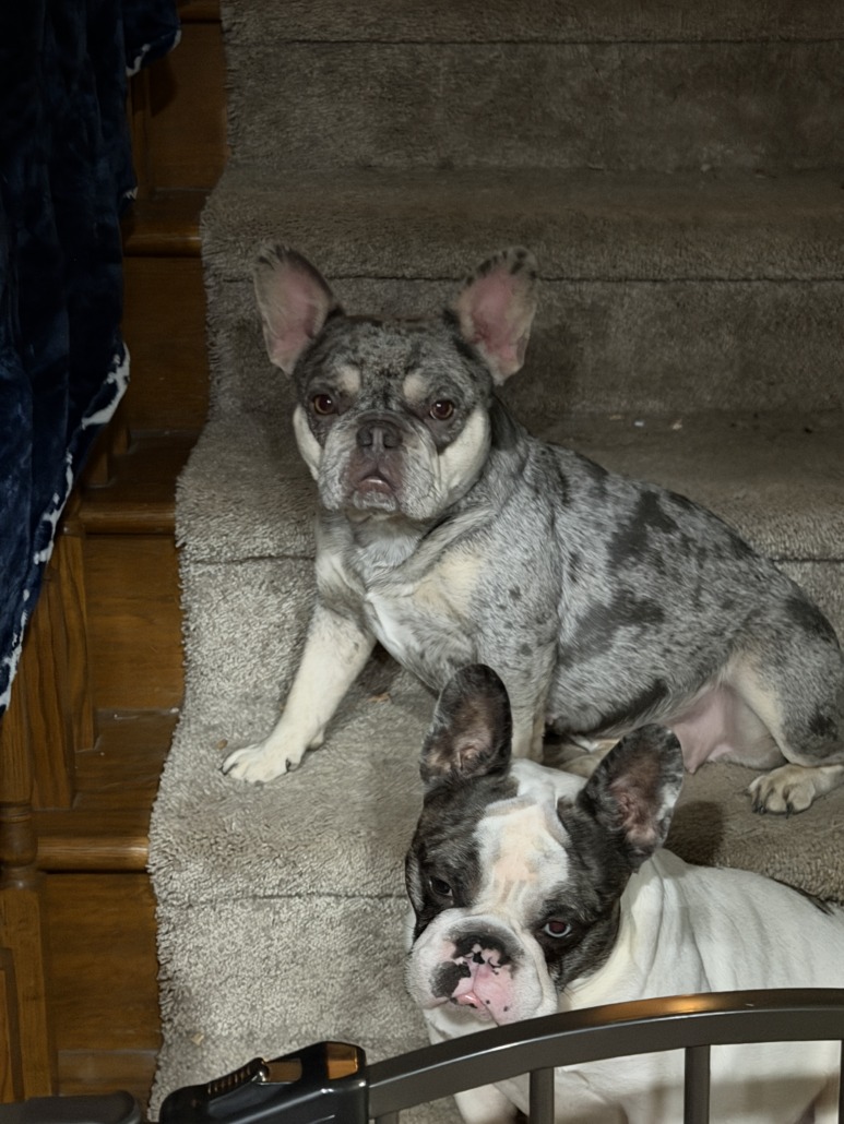 Gray/Merle French bulldog. No collar or microchip. Will respond to Laniey, Laniey Bug, or Bug/Buggy. She is friendly.