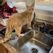 Hannibal is a very light colored orange cat. He has greenish yellow eyes and he is pretty slender. He is very sweet but can be skittish with new people.