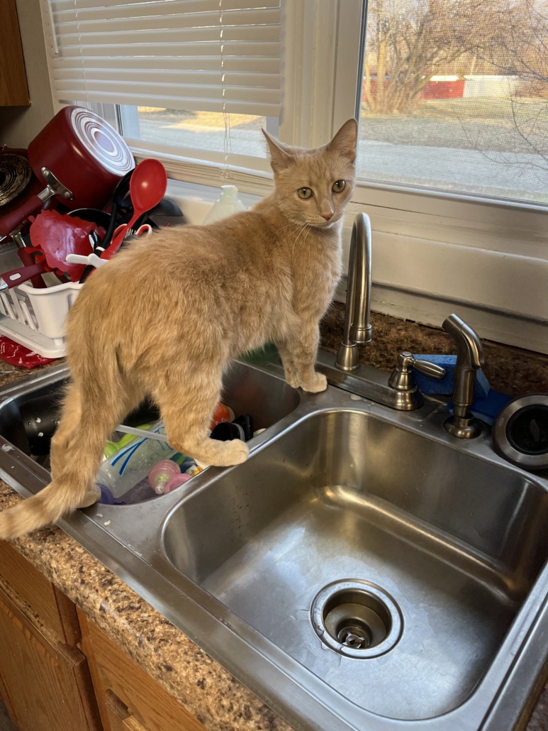 Hannibal is a very light colored orange cat. He has greenish yellow eyes and he is pretty slender. He is very sweet but can be skittish with new people.