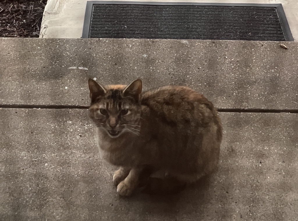 Tabby with light brown highlights. Very friendly, I think female, possibly pregnant? Proof of ownership is required.