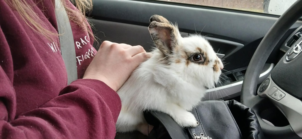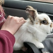 Small, long hair rabbit. Mostly white with brown and black ears and markings. Proof of ownership required