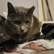 All Grey with a split in her left ear. Super friendly and was wearing a pink cat collar
