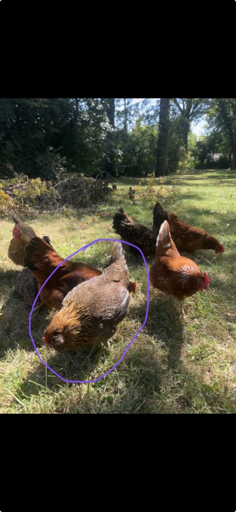 Chicken with brown/black body, light brown head, tufts on the side of the head