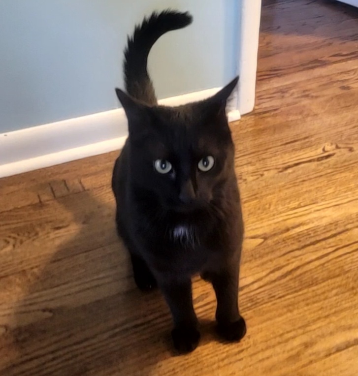 Black cat with yellow eyes and a little white tuff of fur on chest. Proof of ownership required.