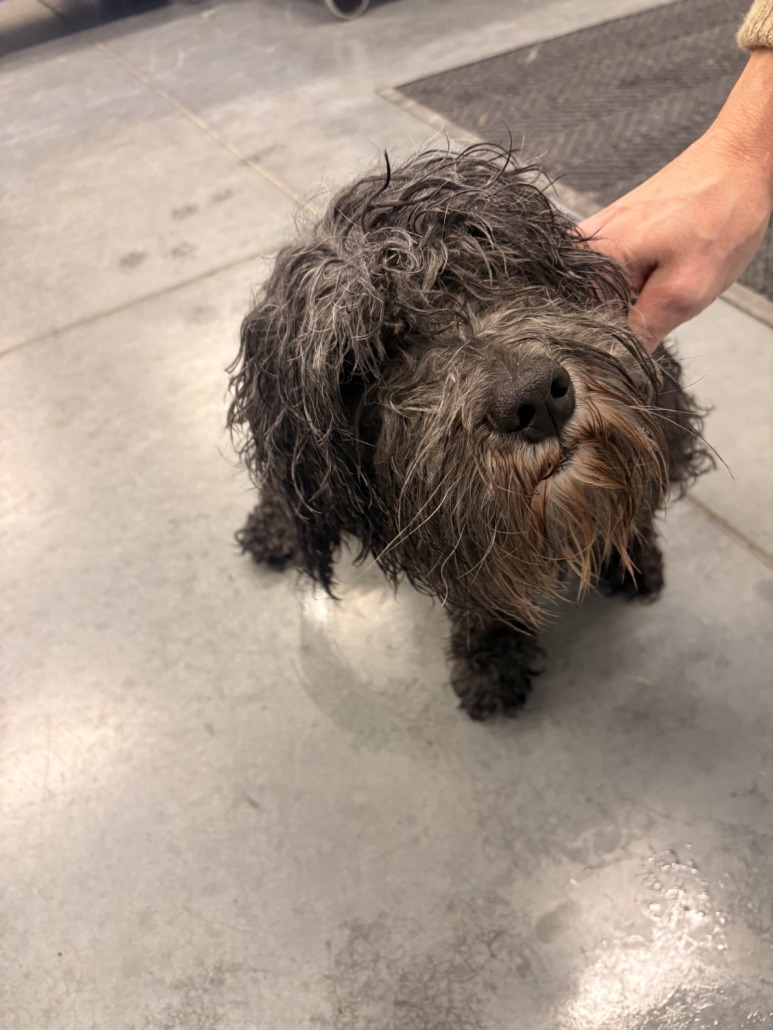 he has no collar, or microchip. he had a shirt on but we took it off because it was wet and cold.