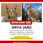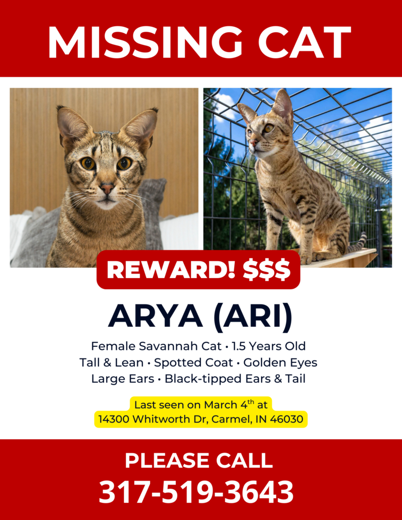 Lost Cat, Alert #96310 Arya missing near Carey road and Edinburg drive, Carmel46033