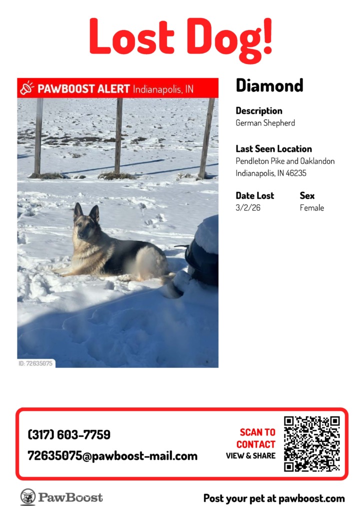 Lost Dog, Alert #96346 Diamond missing near Pendleton Pike/ Oaklandon, Indianapolis46235