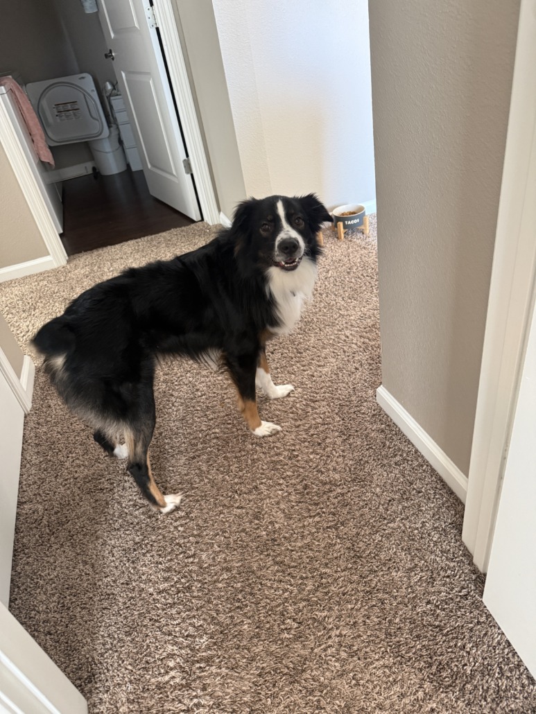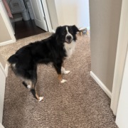 His name is Banks. He’s 2 years old. Primarily black but has brown and white on his coat also. Australian Shepherd. Very skittish and shy, so he may not like to be approached fully as he’s usually scared of his own shadow. Very sweet dog. Has a blue collar on with me and his dad’s contact information on it.