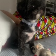 Porsha is a small female Shih Tzu with a mostly black fluffy coat and a white chest. She has big dark eyes and a sweet face. She is freshly groomed with a neat haircut and was wearing a gray collar when she went missing. She is friendly and gentle but may be scared.