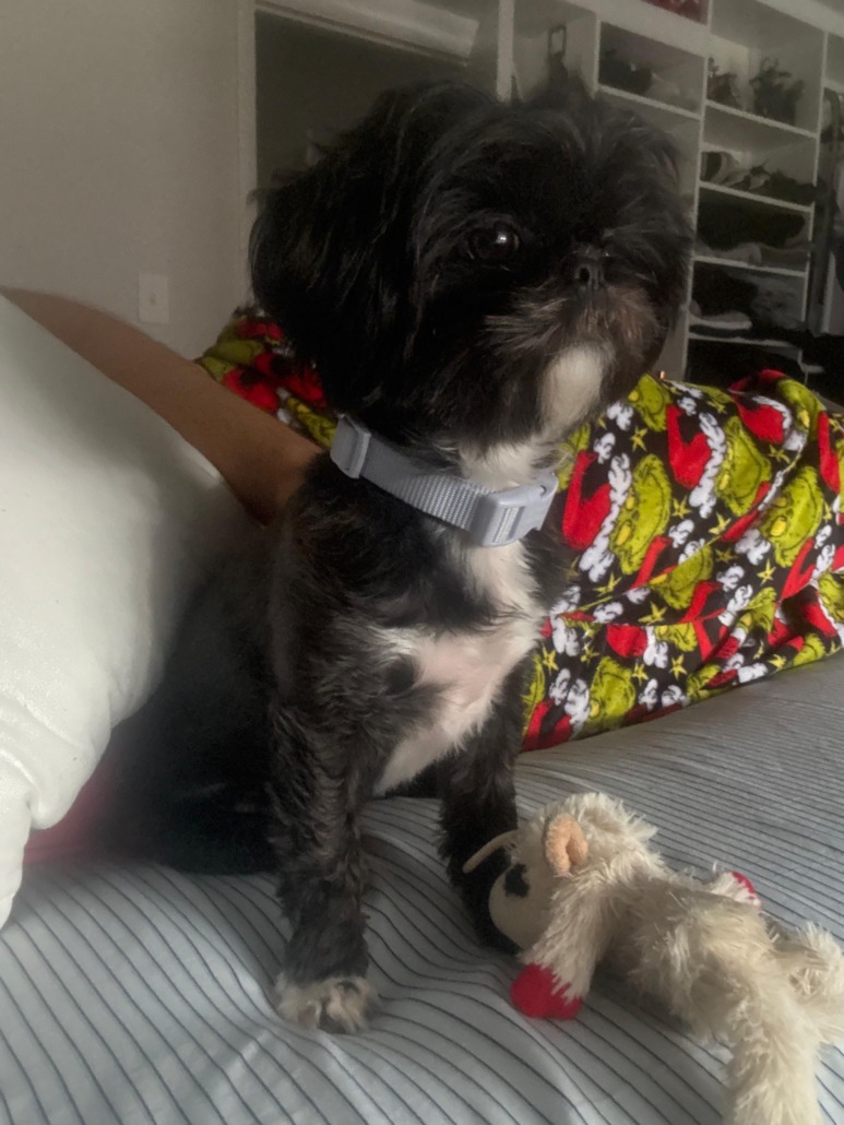 Porsha is a small female Shih Tzu with a mostly black fluffy coat and a white chest. She has big dark eyes and a sweet face. She is freshly groomed with a neat haircut and was wearing a gray collar when she went missing. She is friendly and gentle but may be scared.