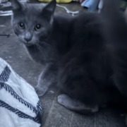 Small vocal grey female kitten showed up today after getting home. Skittish but friendly proof of ownership required