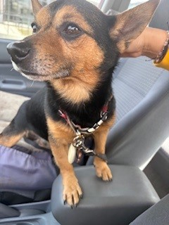 Small mostly black with brown markings. Seems to be a Chihuahua mix. Proof of ownership will be required