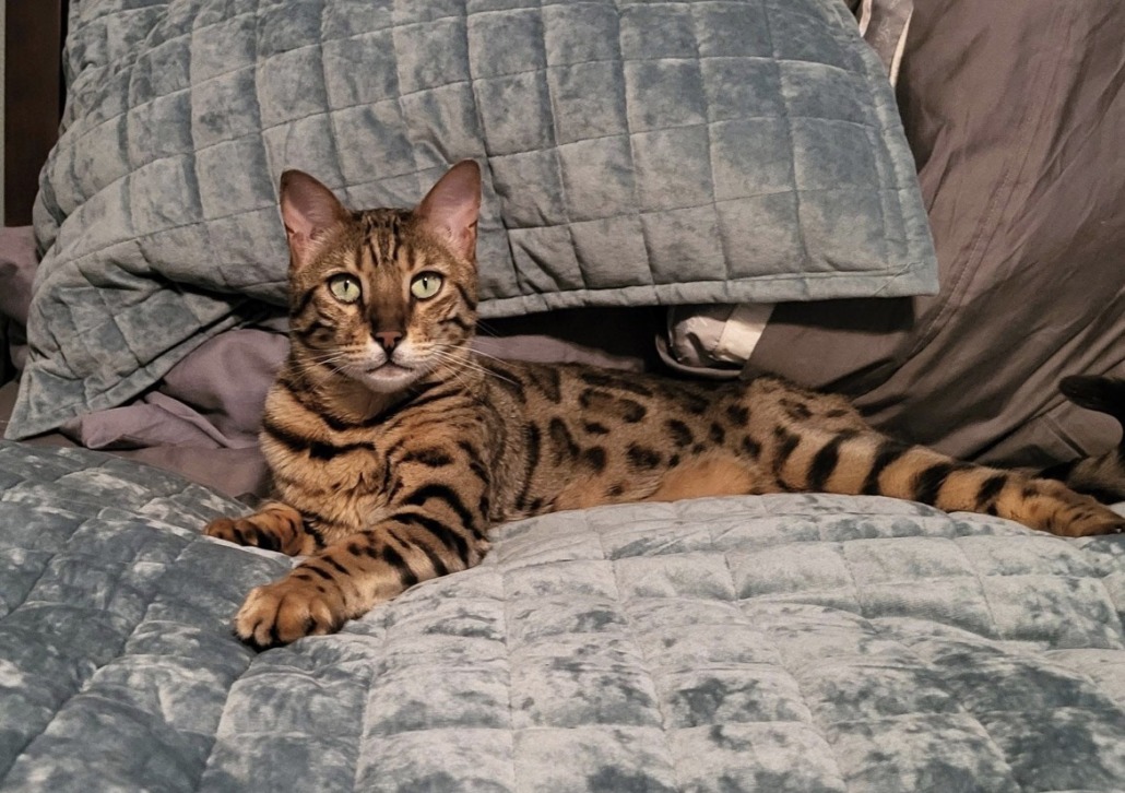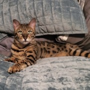 Tan male bengal with black spots and green eyes
