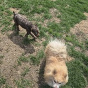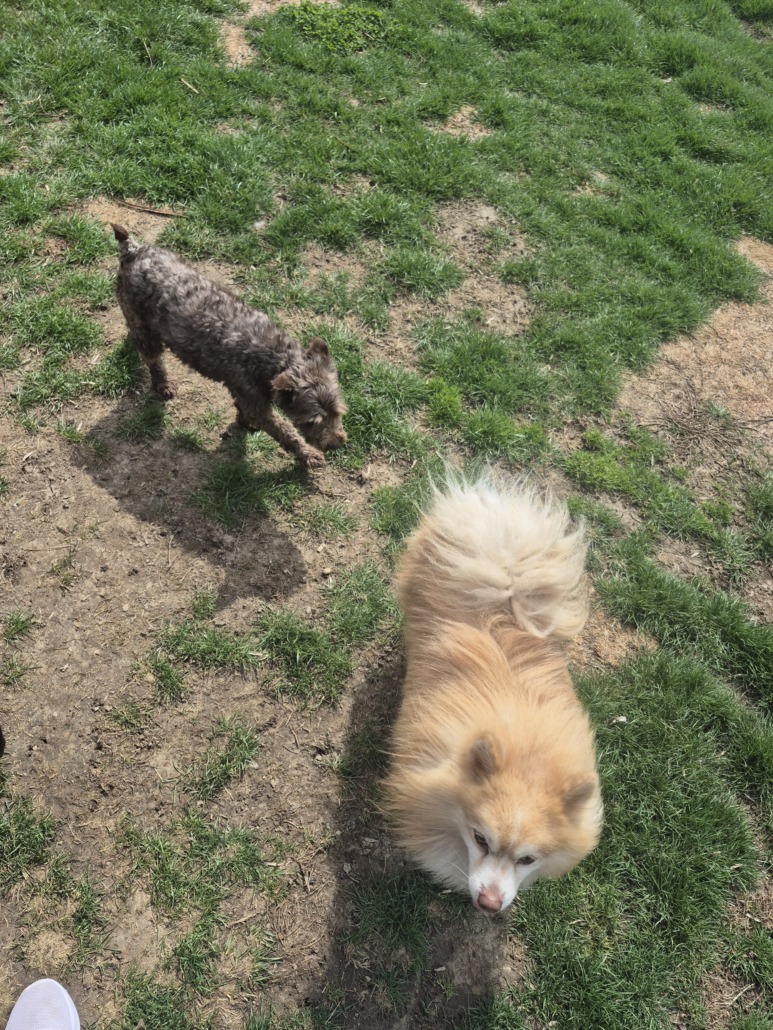A blond pomeranian & a brown schnauzer