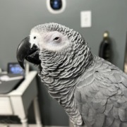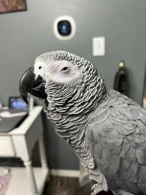 Congro african grey. Grey body with Red tail. pretty large bird about 10 inches tall.