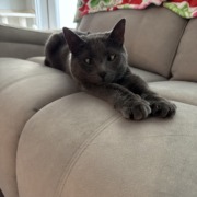 Grey wearing a stars/moon collar with a bell. Proof of ownership required.