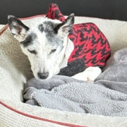 Candy is a elderly jack russell white with black she is a nice dog but she has arthritis she has a black color on with jewels her name tag is blue with her name she also has her tag from VCA on.