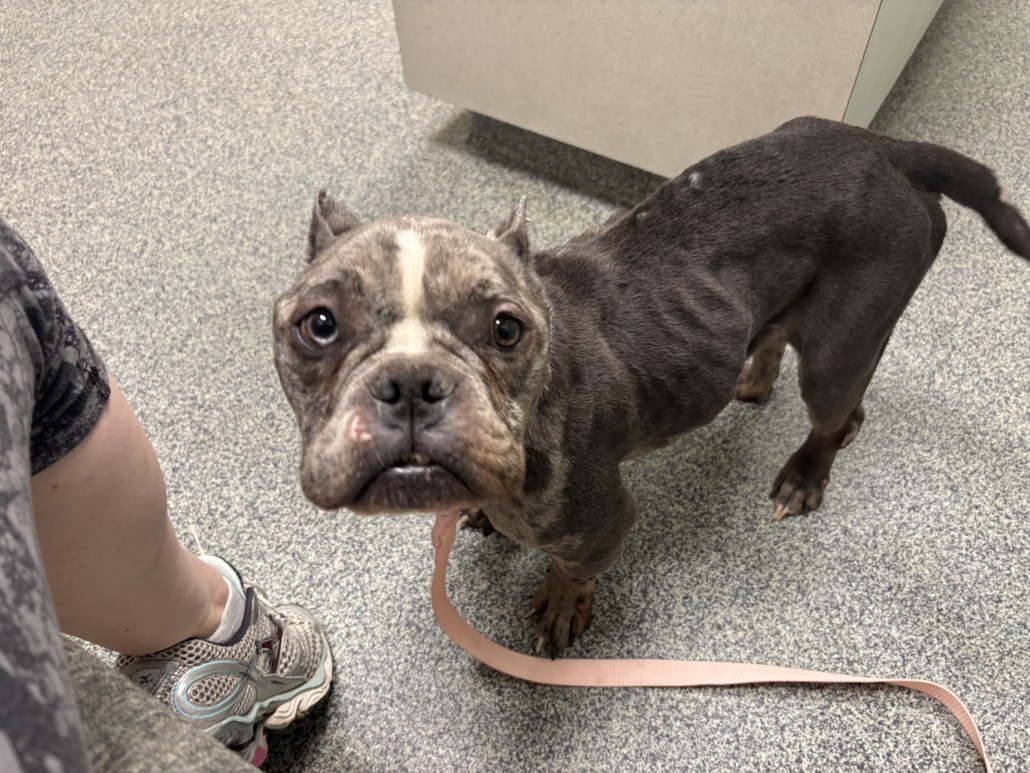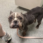 Bully Pit, Female. Found starved and covered in sores from what looks like improper confinement/ life spent in a crate. Seems to have been dumped by an irresponsible breeder (signs of previous litter). If you try to claim her, must provide proof of ownership via photos and vet care records; AND you must provide proof of compliance with animal welfare laws- including evidence of having searched for your lost pet and proof that she was not being starved prior to escape.