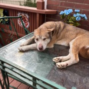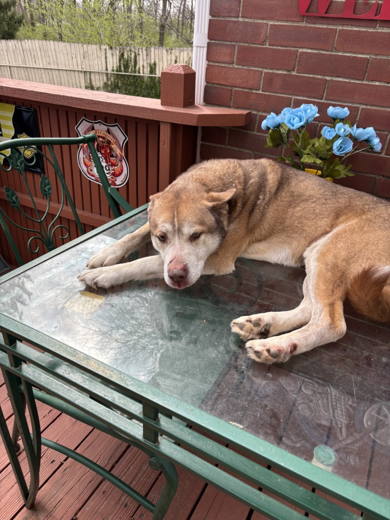 Waste are clipped , looks to be a husky mix. Very friendly. He’s chilling on my parents back porch with food and water.