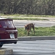 Brown bully breed seen roaming the parking lots of the Extended Stay America at 5350 W Southern Ave, and nearby office buildings. Has also been roaming the Jimmy John’s and hotels across the street. I didn’t want to approach with my reactive dog, but seems friendly. Wearing a collar (gray or black I think).