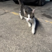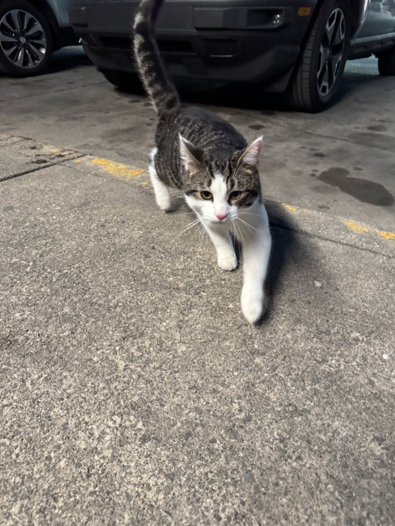 The cat I’m not sure if it was male or female. It was white on the belly and legs, the whole back and top of it was dark grey with black spots kinda like a cheetah. EXTREMELY playful and sweet, well fed, clean, healthy. Had to be someone’s pet