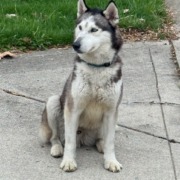 This is a small, young huskie. He is very skittish. He hasn’t come close enough for us to get a leash on him yet, but he is staying nearby. He has a green collar on.