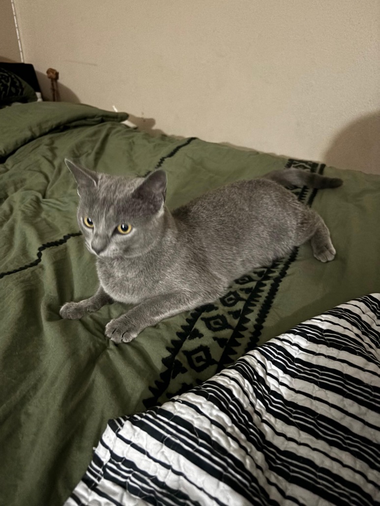 Very small looks like a female, she’s been coming around my porch and been feeding her the past two weeks. She seems super clean to be a stray. Proof of ownership required
