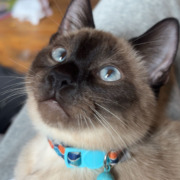 He’s a very jumpy cat and gets scared easily. He has a blue collar with a bell on it. He is a siamese cat. He’s usually very cuddly once he’s comfortable. also his eyes seem crossed
