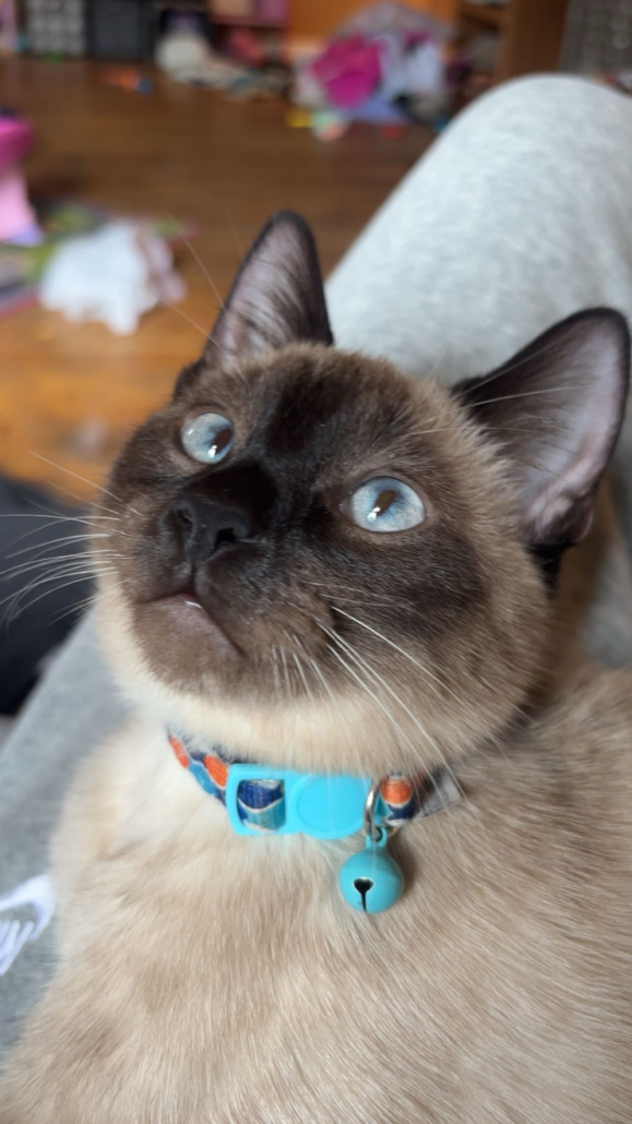 He’s a very jumpy cat and gets scared easily. He has a blue collar with a bell on it. He is a siamese cat. He’s usually very cuddly once he’s comfortable. also his eyes seem crossed
