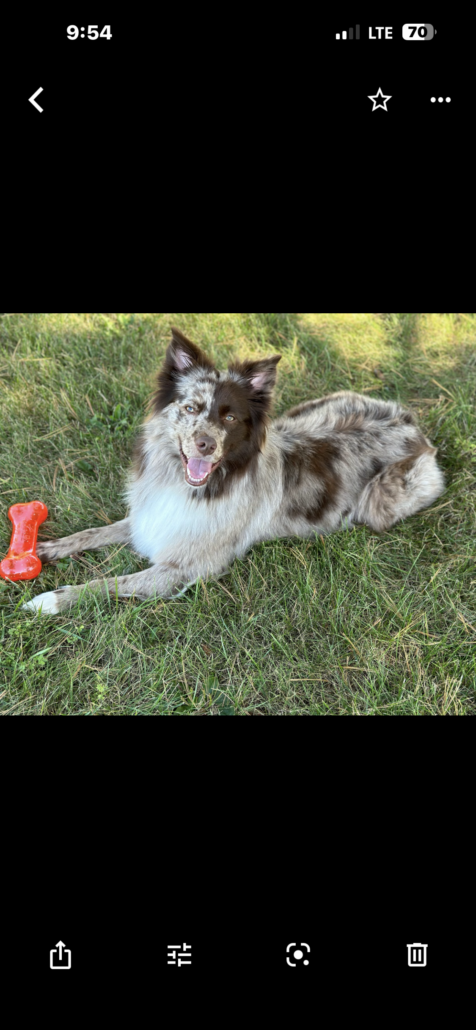 3 yr old mini Aussie. Half face brown other other half white with some specs of reddish brown. He has Addisons disease and has to have his medication to live, so it’s crucial he finds his way back home to us. Not fond of strangers .