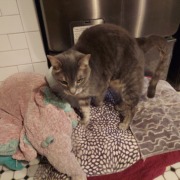 Milo is a large grey tabby with green eyes and a white/cream-colored underbelly. He is typically very skittish, but may respond to his name, “here Kitty kitty”, or shaking a bag of treats/food.