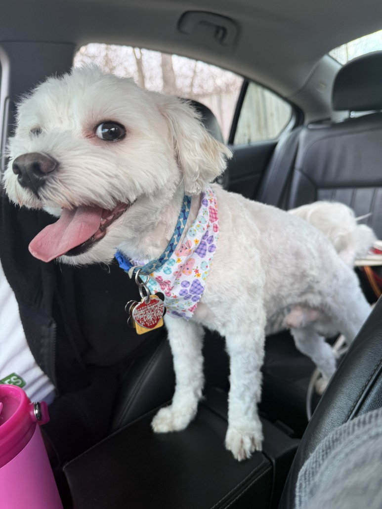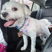 Chewy is small white shitzuh /bishon mixed very friendly and has a blue collar with address