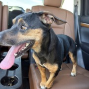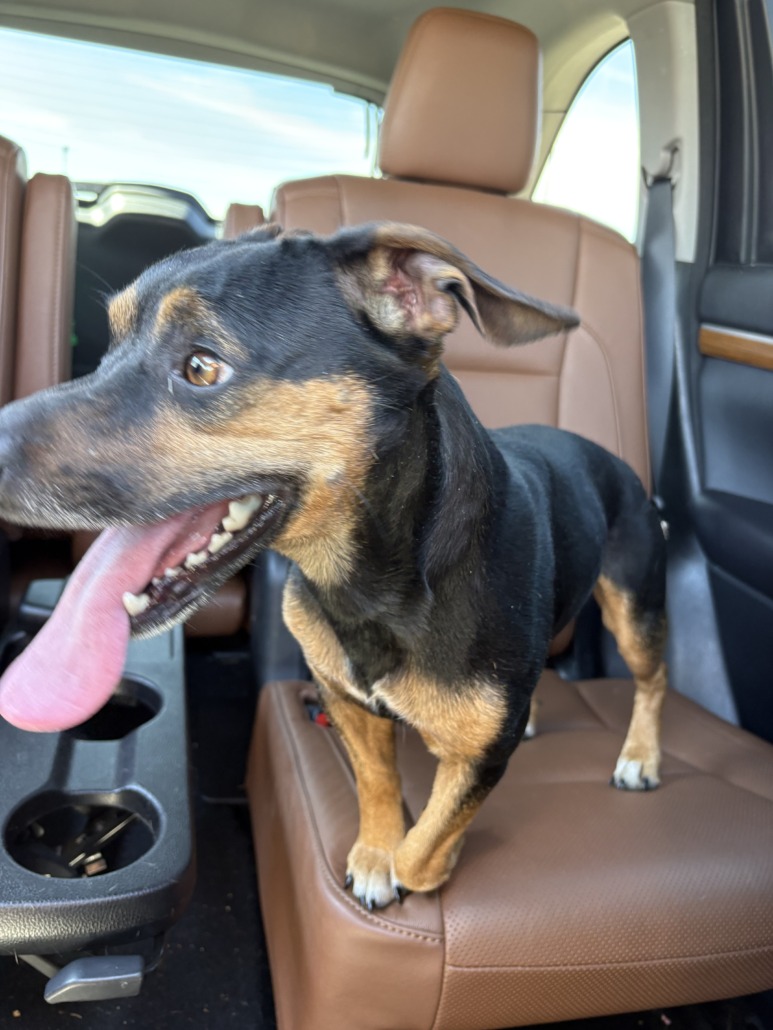 Dachshund/mini Doberman mix looking male dog. UNneutered. Deformed/injured front left foot. Very friendly. Found with a tan medium female pit bull mix dog