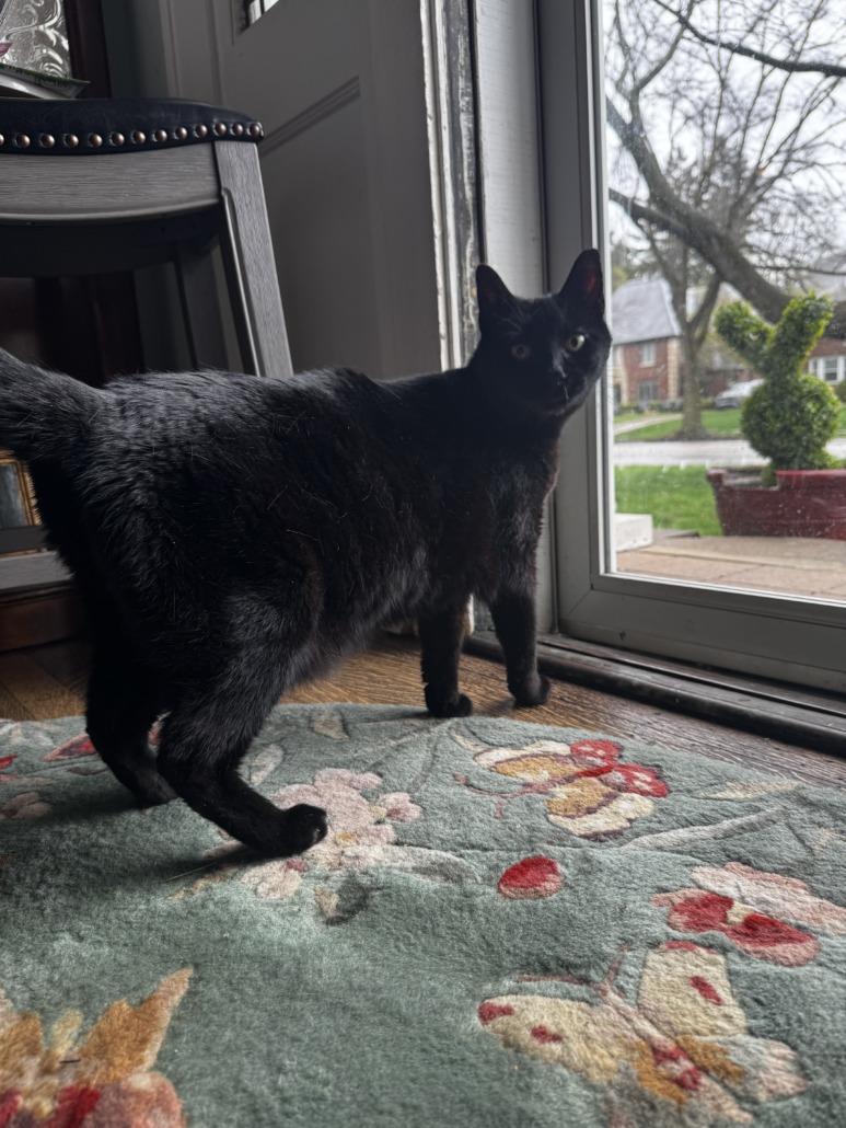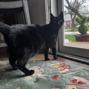 This cat showed up at our house and was starving. She hung around for a couple days then wanted to come inside. She is very friendly. Proof of ownership is required.