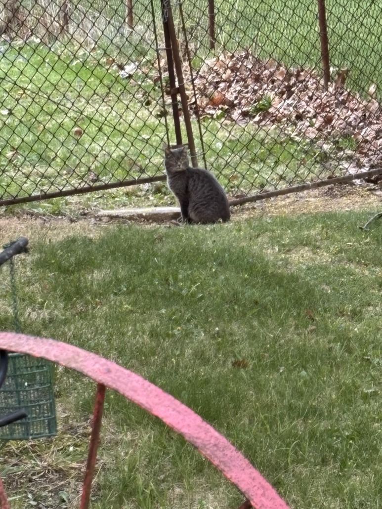Very fearful of people, won’t come near me. Runs away as soon as it sees someone. Grey tabby.