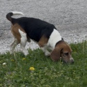 Looks like a beagle, howls like a bloodhound occasionally. Completely ignored me, like maybe it’s deaf and/or blind. Saw it at night in the field south of Belfry a few nights ago too.