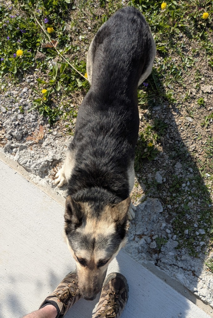 I saw a German Shepherd and a Husky this morning, April 12, around 10:30, nearby there Fall Creek/Emerson/Kessler intersection. They were uninterested in offers of toys or treats.