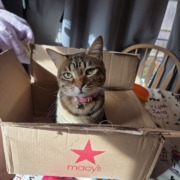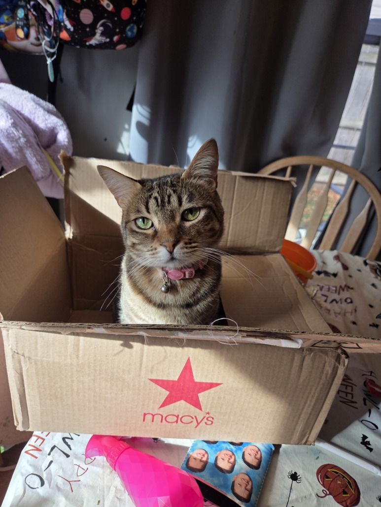 Brown, small tabby. Very sweet and friendly. She is wearing a pink collar with a bell.
