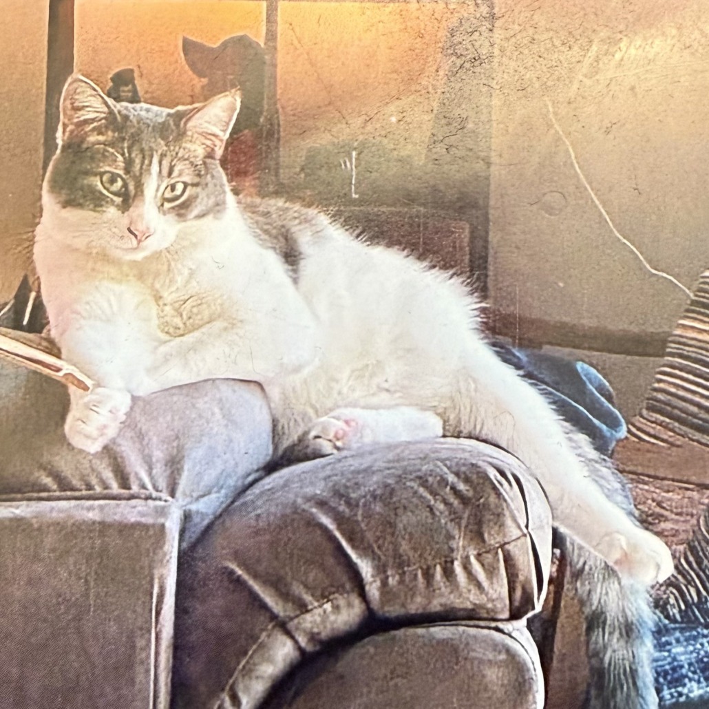 Male cat grey and white. He is very shy and timid. He may not come out of hiding willingly. He is about 3-4 years old.