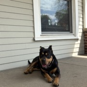 Black with brown on face and legs. Not neutered. Very sweet and docile. Found in Spades Park