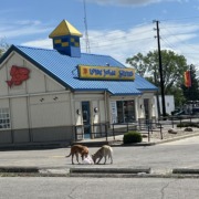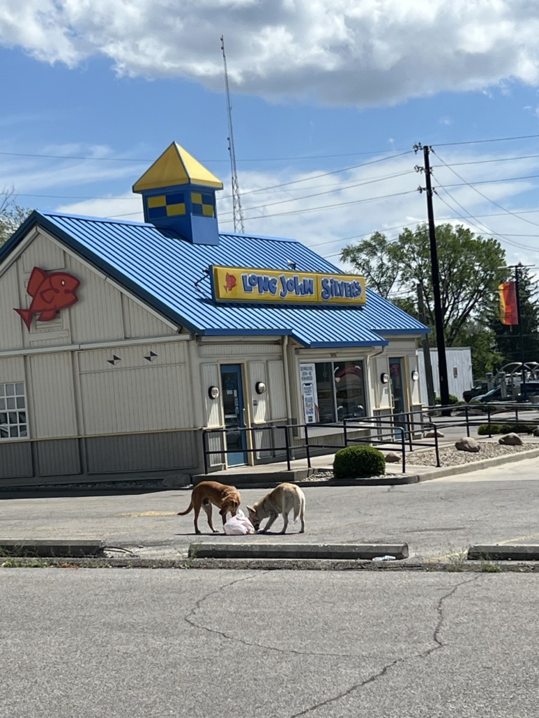 I see two dogs in front of my work . They are two dog large the address is 3429 s east st. 46227