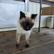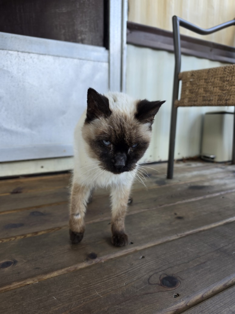 Siamese cat walked right on my friends porch. Skinny and thing on it. Taking it to get scanned for microchip.